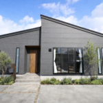 広い敷地に際立つブラックのガルバリウム鋼板と天然木のレッドシダーのコントラストの効いたスタイリッシュな外観。室内は梁や柱を魅せた暖かみのあるインテリア。